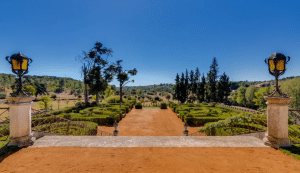 Outside, there are geometrically designed gardens and a swimming pool, as well as other buildings such as a chapel, stables, wine cellar, lakes, watercourses, and an agricultural area.