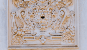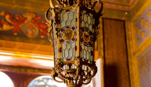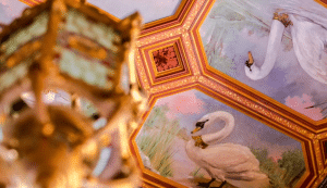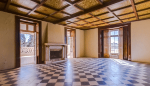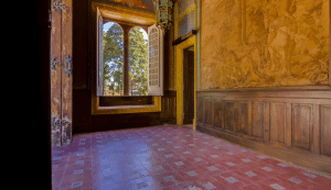 Inside, some rooms include uniquely detailed fireplaces, painted ceilings, and 19th century tile panels.